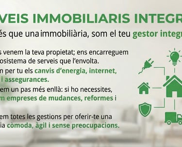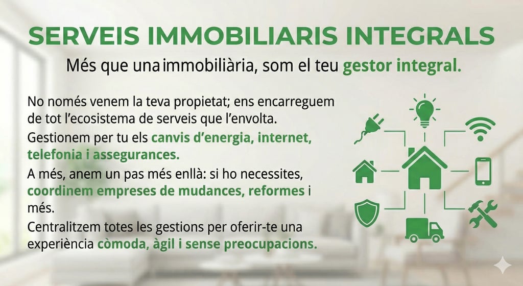 No sols venem la teva propietat; ens encarreguem de tot l'ecosistema de serveis que l'envolta. Gestionem per tu els canvis d'energia, internet, telefonia i assegurances. A més, anem un pas més enllà: si ho necessites, coordinem empreses de mudances, reformes i més. Centralitzem totes les gestions per a oferir-te una experiència còmoda, àgil i sense preocupacions.